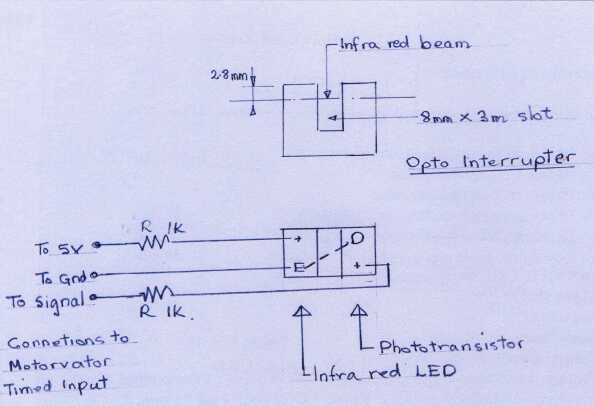 This figure also shows a circuit for connection to the Motorvator Timed Input Port. The LED side of the interrupter is sometimes marked with an E and a +. The + should be connected to the +5V on the Motorvator via a current limiting resistor. These opto switches vary but I have found a 1K resistor usually works well. The E should be connected to the Gnd on the Motorvator timed input and also to the diagonally opposite pin on the opto switch which may be marked with an D. The other pin on the transistor side of the opto switch is connected to the signal pin on the Timed Input of the Motorvator. (See Motorvator Manual) via a current limiting resistor. Again I have found a 1k resistor works well on the various opto switches I have tried.